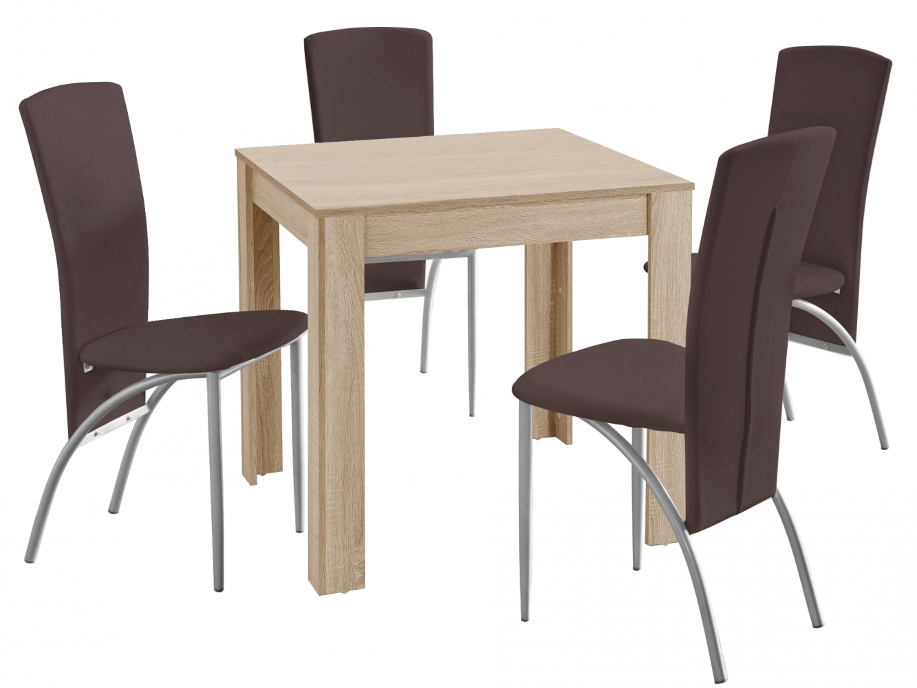 Jídelní set Dane je moderní jídelní nábytek, který se hodí do všech interiérů. 4 jídelní židle s měkkým čalouněným sedákem syntetickou kůží vás zaujmou svým designovým tvarem. Součástí setu je i jídelní stůl z MDF v dekoru dubu.