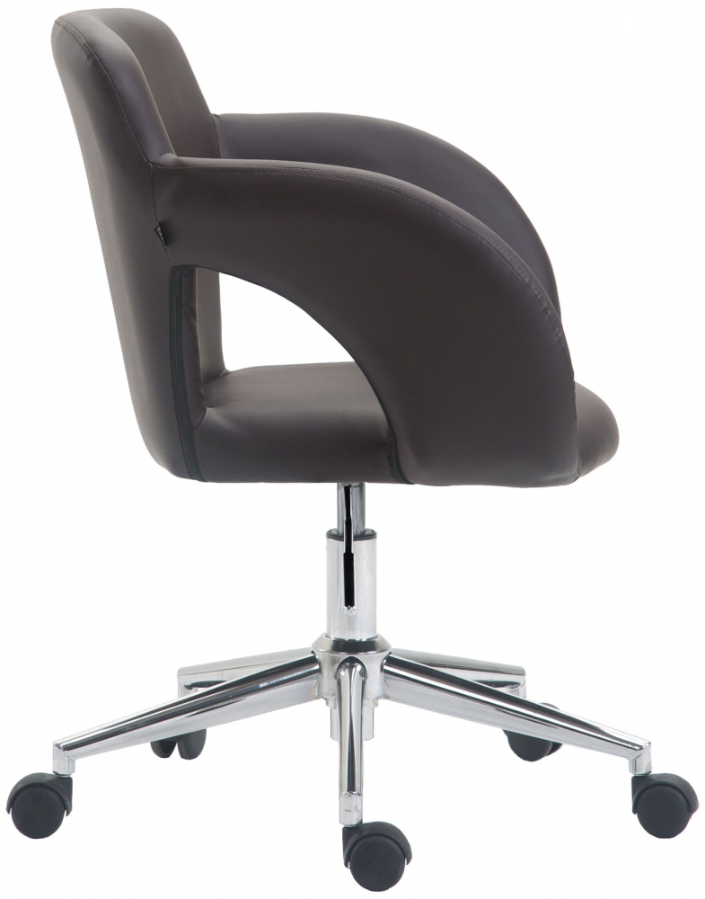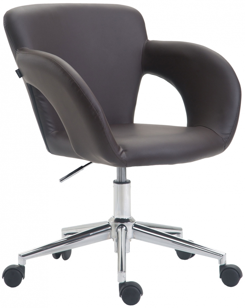 Kancelářské křeslo Edison je moderní sedací nábytek s podnoží z pochromovaného kovu a sedáku z kvalitní syntetické kůže v hnědé barvě. Užijte si příjemné sezení i při práci! Tato kancelářská židle je vhodná do jakékoliv kanceláře či pracovny.