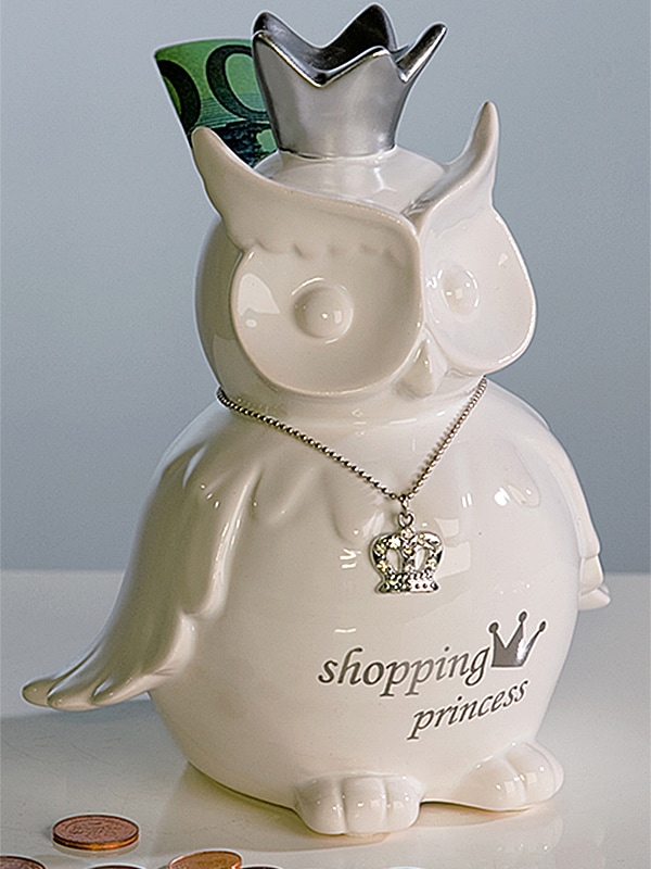 Znáte ženu, která nerada nakupuje? Možná ano, ale určitě je jich výrazná menšina! A právě pro onu většinu máme dalšího milého pomocníka, který hravě pomůže s šetřením na další nákupy. Keramická kasička Shopping Owl je roztomilá sovička s dychtivým výrazem, stříbrným náhrdelníkem a korunkou. Kdo by nechtěl, aby mu tato princezna střežila jeho našetřené penízky? A nebojte se, pokud budete ušetřené peníze potřebovat, nemusíte kasičku rozbíjet. Stačí sovičku otočit a zespodu mince vysypat. Šetřete stylově, šetřete se sovou...